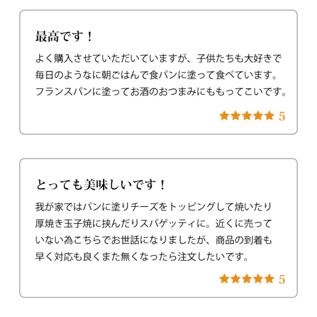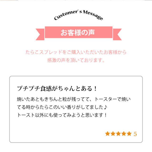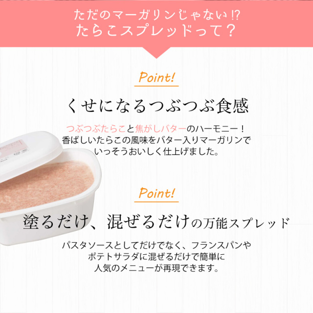 | 特徴 | パンに塗ってトーストしたり、パスタソースに使ったりもできる便利な1品です。たらこのつぶつぶ食感がくせになります。 |