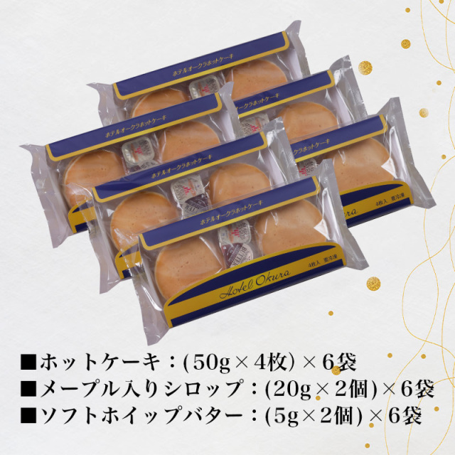| 特徴 | 株式会社ホテルオークラエンタープライズ料理長が監修した本格ホットケーキ。 北海道産小麦・牛乳を100%使用し、ふんわり手焼き風に仕上げました。 バニラやミルクの風味を生かした甘みのあるホットケーキです。 メープル入りシロップ、ソフトホイップバター入りですぐにお召し上がりいただけます。 |