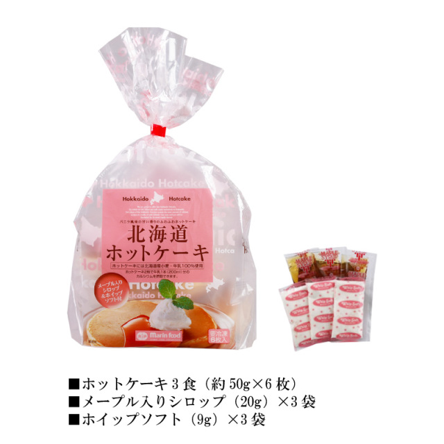 | 内容量 | ■ホットケーキ:約50g(直径約11cm)2枚×3袋 ■メープル入りシロップ:60g(20g×3袋) ■ホイップソフト:27g(9g×3個) |
