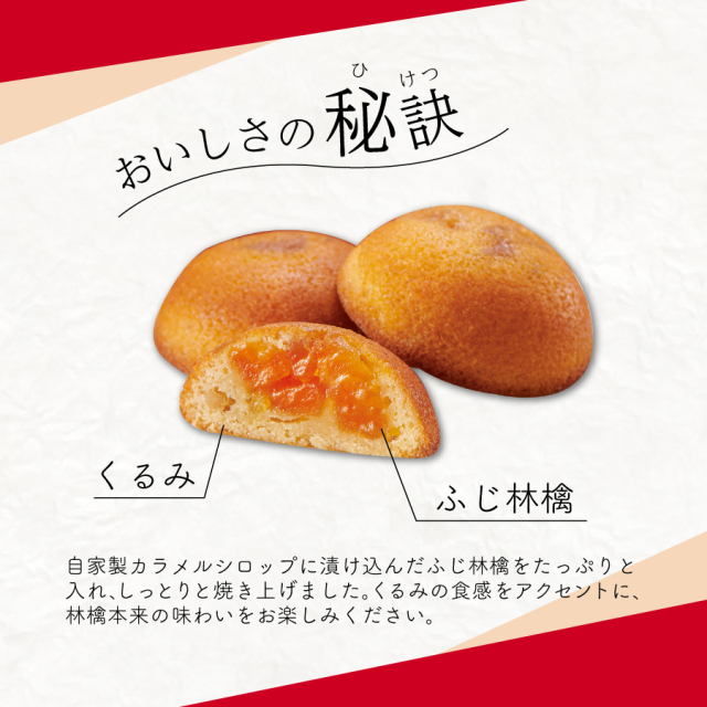 | 特徴 | 自家製カラメルシロップに漬け込んだふじ林檎をたっぷりと入れ、しっとりと焼き上げました。くるみの食感をアクセントに、林檎本来の味わいをお楽しみください。 |